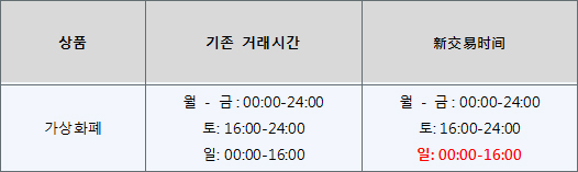 또한 업데이트 기간동안 가상화폐 시장은 폐장되며 해당 시간에는 가상화폐 거래가 불가합니다. 주말동안 가상화폐 상품의 거래 시간은 다음과 같습니다: