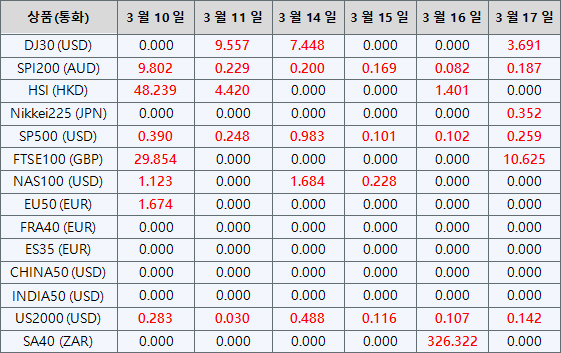 아래의 지수CFD 상품 배당금은 향후 일정에 따라 조정될 예정입니다. 지수CFD에 대한 상세내용은 배당금 지급일 전날 마감 후, 잔액 부분에 “Div &<거래상품명>&<순 거래량>”형식으로 표시됩니다.