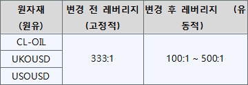 원자재(원유) 상품의 레버리지 조정은 고객 계좌의 레버리지 설정에 따라 상이하기 때문에, 만약 귀하의 계좌 레버리지가 100:1로 설정되어 있다면, 변경 후 원자재(원유) 레버리지는 100:1이 될 것이며, 귀하의 계좌 레버리지를 500:1로 유지한다면, 변경 후의 원자재(원유) 레버리지도 500:1이 될 것입니다. 따라서, 당사를 이용 중인 고객님은 2022년 2월 18일 이전에 계좌 레버리지를 확인하여 잠재적 리스크에 대비하시기 바라며, 필요시 계좌에 충분한 자금을 예치하여 신중히 거래하시길 권장 드립니다.