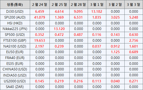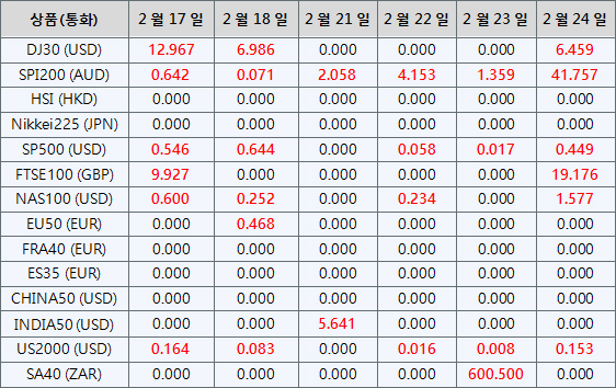 아래의 지수CFD 상품 배당금은 향후 일정에 따라 조정될 예정입니다. 지수CFD에 대한 상세내용은 배당금 지급일 전날 마감 후, 잔액 부분에 “Div &<거래상품명>&<순 거래량>”형식으로 표시됩니다.