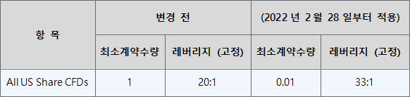 안녕하세요. PUPRIME은 고객님의 우수하고 최적화된 거래환경을 위해, 2022년 2월 28일부터 당사가 제공중인 미국 주식 CFD상품의 최소계약수량 및 레버리지를 조정합니다.
