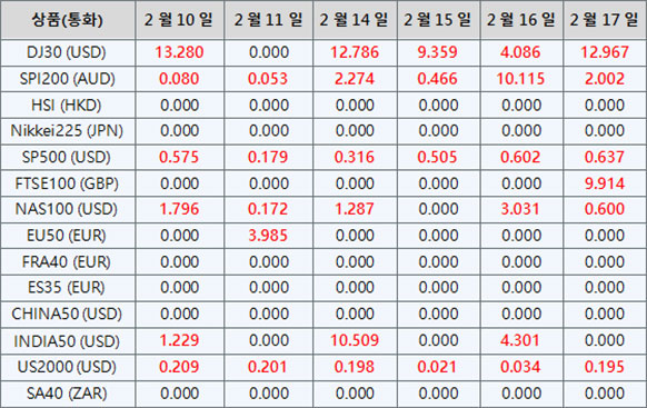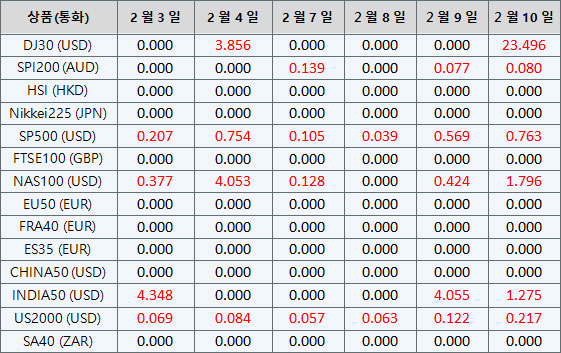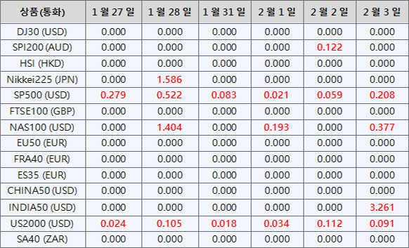 아래의 지수CFD 상품 배당금은 향후 일정에 따라 조정될 예정입니다. 지수CFD에 대한 상세내용은 배당금 지급일 전날 마감 후, 잔액 부분에 “Div &<거래상품명>&<순 거래량>”형식으로 표시됩니다.