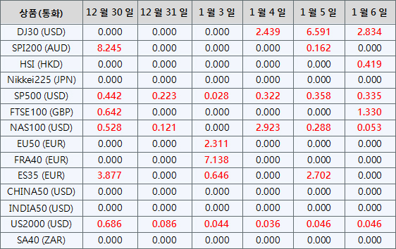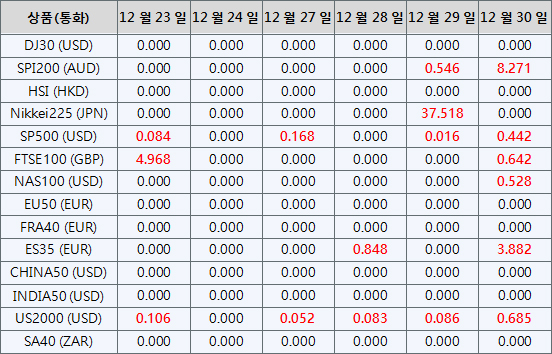 아래의 지수CFD 상품 배당금은 향후 일정에 따라 조정될 예정입니다. 지수CFD에 대한 상세내용은 배당금 지급일 전날 마감 후, 잔액 부분에 “Div &<거래상품명>&<순 거래량>”형식으로 표시됩니다.