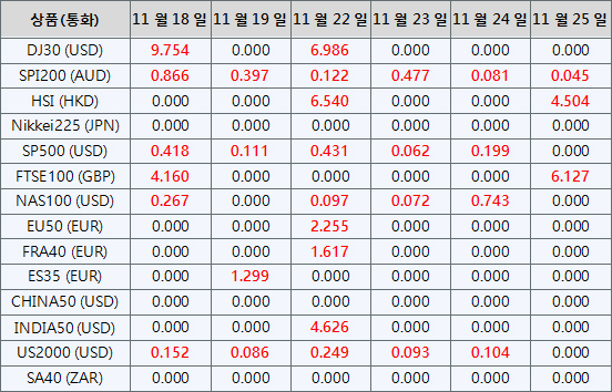아래의 지수CFD 상품 배당금은 향후 일정에 따라 조정될 예정입니다. 지수CFD에 대한 상세내용은 배당금 지급일 전날 마감 후, 잔액 부분에 “Div &<거래상품명>&<순 거래량>”형식으로 표시됩니다.