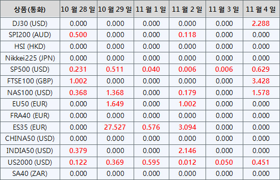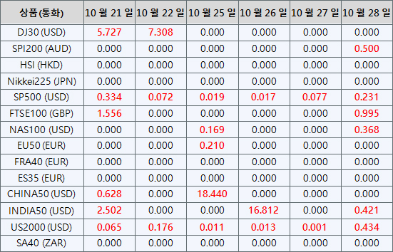 아래의 지수CFD 상품 배당금은 향후 일정에 따라 조정될 예정입니다. 지수CFD에 대한 상세내용은 배당금 지급일 전날 마감 후, 잔액 부분에 “Div &<거래상품명>&<순 거래량>”형식으로 표시됩니다.