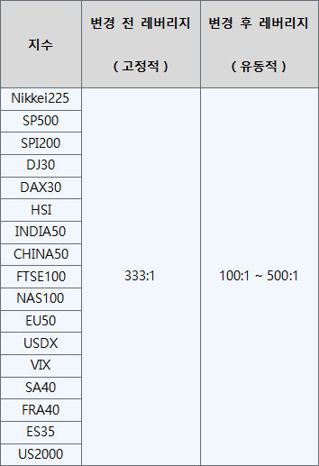 지수 상품의 레버리지 조정은 고객 계좌의 레버리지 설정에 따라 상이하기 때문에, 만약 귀하의 계좌 레버리지가 100:1로 설정되어 있다면, 변경 후 지수 레버리지는 100:1이 될 것이며, 귀하의 계좌 레버리지를 500:1로 유지한다면, 변경 후의 지수 레버리지도 500:1이 될 것입니다. 따라서, 당사를 이용 중인 고객님은 2021년 11월 1일 이전에 계좌 레버리지를 확인하여 잠재적 리스크에 대비하시기 바라며, 필요시 계좌에 충분한 자금을 예치하여 신중히 거래하시길 권장 드립니다.