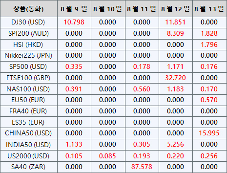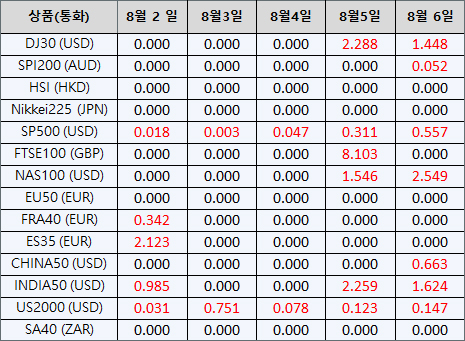 아래의 지수CFD 상품 배당금은 향후 일정에 따라 조정될 예정입니다. 지수CFD에 대한 상세내용은 배당금 지급일 전날 마감 후, 잔액 부분에 “Div &<거래상품명>&<순 거래량>” 형식으로 표시됩니다.