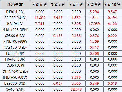 아래의 지수 CFD 상품 배당금은 향후 일정에 따라 조정될 예정입니다. 지수 CFD에 대한 상세내용은 배당금 지급일 전날 마감 후, 잔액 부분에 “Div &<거래상품명>&<순 거래량>” 형식으로 표시됩니다.