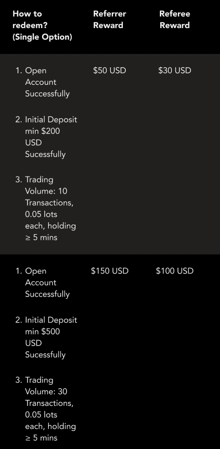 7. This refer reward display within the client portal promotion page and be shown in the form of exchange coupon. After the referred client completes all the conditions, both parties can obtain the corresponding exchange coupon. By clicking the “Redeem”, the coupon amount will be transferred to the balance of the trading account automatically. The coupon shown at different stage: